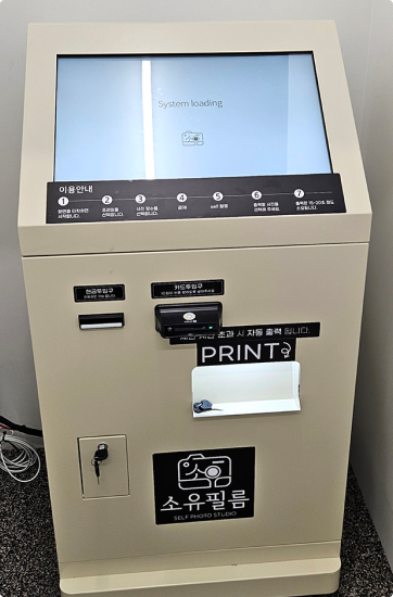 사진을 직접 촬영하고 즉시 인화할 수 있는 자동화된 셀프 스튜디오형 키오스크입니다.
